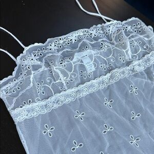 Good preowned condition except for some fraying on adjustable spaghetti straps. Sheer white fabric with eyelet floral pattern. SZ L. Please confirm measurements approximate laying flat in pictures as Poshmark does not accept returns for fit issues. Please scroll to see all six photos provided.