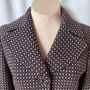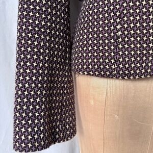 Elevate your style with this decidedly tailored silhouette, single-breasted, 2 button blazer designed to accentuate your waist. The fabric is weaved into a purple and black houndstooth, star- like pattern.