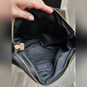 Excellent used condition Coach Mae Crossbody Black Pebbeled Grain Leather with goldtone hardware. Style: F34823, leather is soft with high shine luster finish. Top of purse has minor wear shown on in pictures, no sticky resisdue, no rubbing, no stains peeling scratches or callouts. Measures 11.5 inches by 10.5 inches by 2.75 inches. Zip-top closure, fabric lining. Inside has multi function button closure side pocket. Outside front zipper closure pocket. Adjustable 20-inch long strap wear as shoulder or or crossbody. Ships from smoke-free and pet free home.
