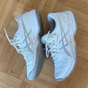 Comfortable ASICS running shoes in white, gray & silver. Excellent condition, worn a few times to the gym. Non marking soles. Great for the gym, tennis or pickleball!