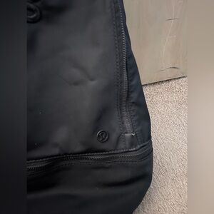 Black lululemon used backpack. Has DMS embroidered monogram and flaws on straps and front as pictured. Used condition, functional.