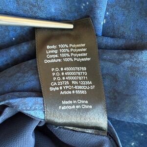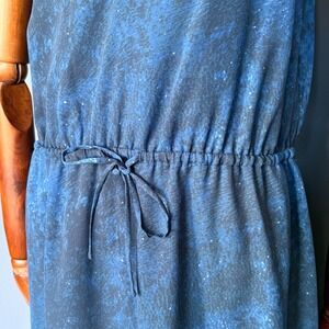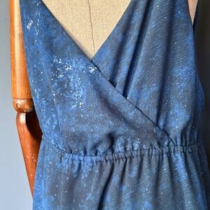 Offered is a beautiful Babaton women's dress crafted from 100% polyester in a deep midnight blue hue with shimmering black and silver accents that resemble a starry night sky. The dress features delicate spaghetti straps, a sleeveless cut, and a bunched cord waistband finished with a bow in the front.