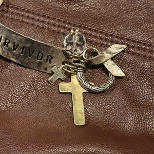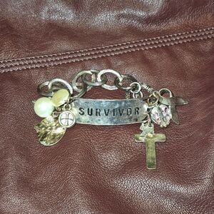 Stylish charm bracelet featuring 'Survivor' plaque, cross, and pearl accents. Perfect for adding a meaningful touch to any outfit.