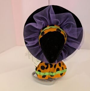 Adorable mouse plush dressed for Halloween. Features a black hat and vibrant orange and purple outfit.