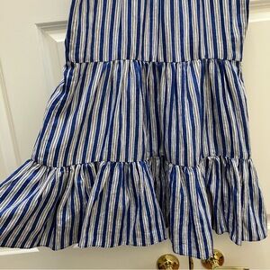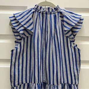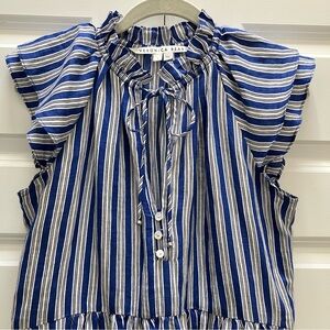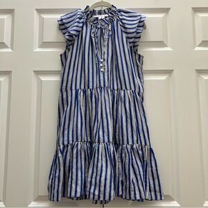Veronica Beard "Zee" mini dress in a linen, viscose blend. Full tiered skirt, for a flowy feel. Flutter sleeves. Three button pearlized button closure. Tie at neck can be worn open or closed, for versatility. In "Cobalt Multi" colorway - a classic blue, white, black striped pattern. Great detailing on this perfect spring, summer dress. Size 4.