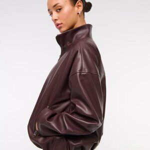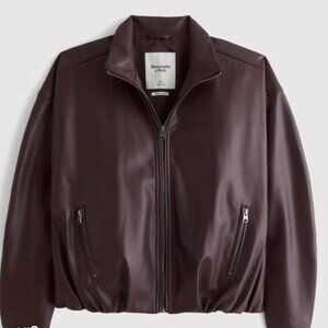 Chic, modern vegan leather bomber jacket from Abercrombie & Fitch in a rich chocolate brown. Features a relaxed, slightly cropped silhouette with a zip-front, stand collar, and zip pockets. Super versatile — perfect over dresses, denim, or athleisure.