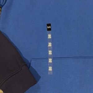 Vibrant royal blue hoodie. Contrasting navy sleeves. Under Armour logo on chest, hood, and front pocket