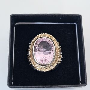 Gorgeous large oval shaped pink tourmaline set in a sterling silver setting with 18k yellow gold framing and ornate details around the center and the shank. Stamped by designer and 925. Size 7.5