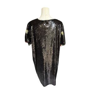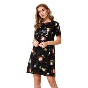 ZARA black sequin dress with multicolor floral embroidery throughout. Relaxed shift silhouette with short sleeves and a straight fit. Fully lined and comfortable, with allover sequins that catch the light beautifully. Easy pull-on style.