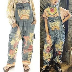 Vibrant denim overalls with artistic designs. Features colorful patterns and playful details. Perfect for a unique style statement.