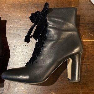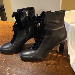 How I wish I would have bought these a half size larger. I’ve worn them twice on special occasions but my feet are a half size larger now. They’re in excellent condition. The leather is soft and supple with crazy beautiful black velvet lace tie ups. Side zipper means getting them off and on was a breeze. Wore them to a wedding and they were fine to wear all night. Comfortable 3.5 inch block heel. The soles make it look like they were worn more than they have been — it was two wears and they’ve been stored in dust bag and box. Very minimal scuffs on leather. For age, truly excellent condition. Not available any more. Made in Italy. Comes with original box and dust bag. Truly beautiful boots I’m sad to part with.