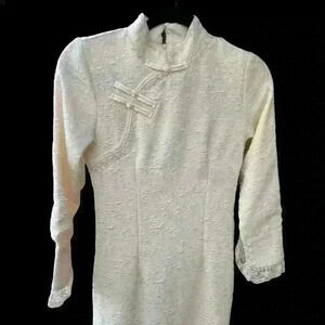 This is an elegant Cheongsam Wedding dress. It is lined and has beautiful buttons and lace on the cuffs. Size small.