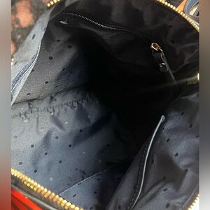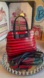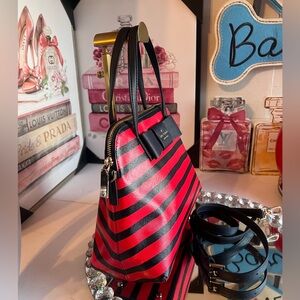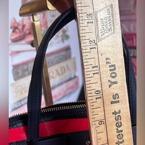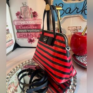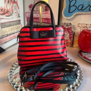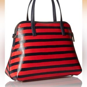 Elegant satchel with striking red and black stripes. Features a top handle and detachable strap.