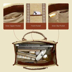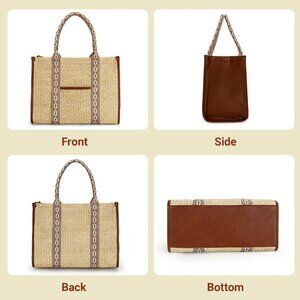 Features: Handmade woven raffia tote with splash-resistant faux PU leather accents on sides and bottom, making it durable and easy to clean. Features a spacious interior with a zipper pocket and inner slip pocket to keep your essentials organized. The front pocket adds quick access to items like your phone or headphones. Versatile carry options with a detachable, adjustable long strap included—wear it as a tote, crossbody, or over the shoulder for ultimate style and convenience.