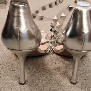 Clear heels with white and silver studded straps.