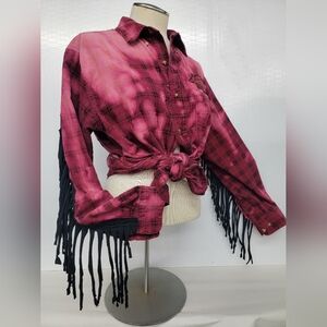 Iron Wheels Moto Flannel Shirt Shacket Harley Davidson Patch & Fringe Upcycled