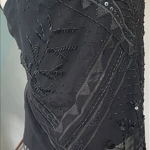 This Rare elegant black sheer Mesh hand Beaded halter style with mesh blouse top is a stunning work of art. At the top of the blouse, there are tiny buttons hidden that you undo to get in and out of the blouse. The bead work is spectacular with beaded flowers all over the mesh with sequins and intricate designs all Hallmark of Vivian Tan’s imaginative artistry . Rare and beautiful there is stretch in the top size 2 shown on a size 6 mannequin with a pit pit measurement of 16 1/2 inches. This is a true collectors piece in beautiful like new condition. The back is breathtaking, gorgeous sheer on the top elegant quiet luxury design. Very lightweight top.