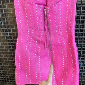 Only worn once and in beautiful condition. Iconic Retrofête Vesta embellished leather dress, size Small. Sold out online with a retail price of $1,195. Two small gems are missing, and there is slight fading on the back left corner of the leather. Despite these minor flaws, the dress presents beautifully and is otherwise in near-new condition.