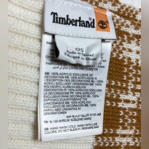 Stylish knit scarf by Timberland. Features a tan and cream pattern. Ideal for adding warmth and style.