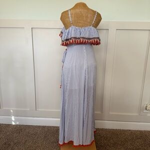 THML Wrap Maxi Dress Women’s Large Blue White Stripe Tribal Fringe Tassels