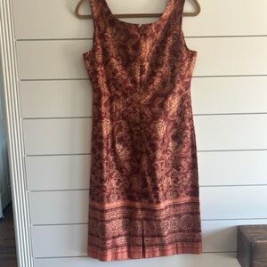 Chic midi dress with intricate floral design. Rich copper tones. Made in Peru of 💯% Pima cotton. Measures 18.5 inches pit to pit; 40 inches in length. No stretch. Zips in the back.