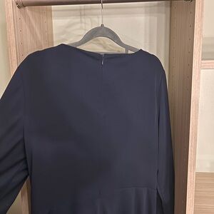 Chic long sleeve dress in deep blue. Wrap design enhances elegance. Perfect for versatile styling. Wore once to a work event. Dry cleaned and ready to ship. I typically wear between a size 12-14. This dress fit like a glove. very comfortable, especially if you are on the larger side on the chest area.