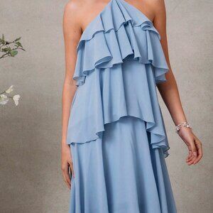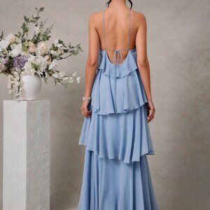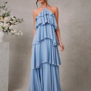 Make a stunning impression at any wedding with this elegant blue maxi dress, designed for the romantic in you. Featuring an oversized fit, this sleeveless dress boasts a halter neckline and a beautifully layered, tiered hem. Perfect for wedding guests, its natural waistline and lined interior ensure a comfortable and stylish experience.