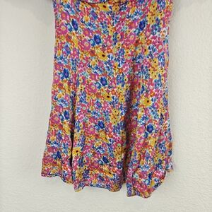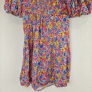 •Smocked back.Chic mini dress with vibrant floral design. Features puff sleeves and a fitted silhouette. Ideal for lively outings.