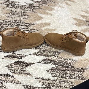 Classic UGG chukka boots in tan. Soft suede material. Cozy interior lining. Small stain on right boot on top. Looks light on left boot from dust. Pretty confident they can be cleaned and look real nice again. I’m just too lazy and do not want to mess it up.