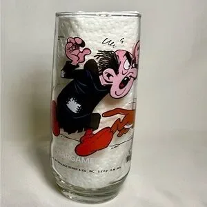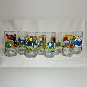 This product is a lot of 13 vintage Smurf glasses from 1982-1983. These glasses feature cartoon characters from the popular TV show "The Smurfs" and are made of glass with a multicolor design. They are part of a limited edition franchise collection. Each glass is a piece of animation merchandise that would be a great addition to any collector's items.