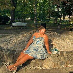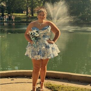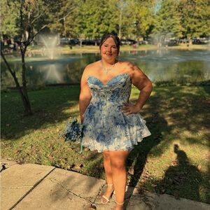 Chic strapless dress by Sherri Hill. Features a stunning blue and white pattern. Ideal for memorable events like homecoming and more. Comes in bag and has tags.