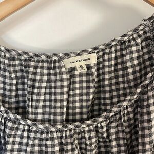 Chic gingham pattern. Off-shoulder design. Flowy mini length. Perfect for casual outings.