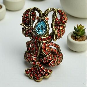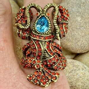 Heidi Daus, lobster ring, Lobster Tales, Swarovski crystal, statement ring, cocktail ring, novelty jewelry, animal ring, coastal glam, beach jewelry, bold jewelry, designer costume jewelry, red crystal ring, blue crystal ring, collectible Heidi Daus, gold tone ring, size 8 ring, couture costume