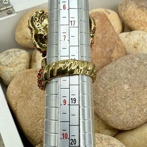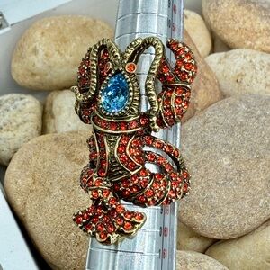 The sculptural lobster motif wraps dramatically around the finger with signature Heidi Daus texture and craftsmanship. This ring is in Excellent Used Condition (EUC) with bright, intact crystals and beautiful gold-tone finish.