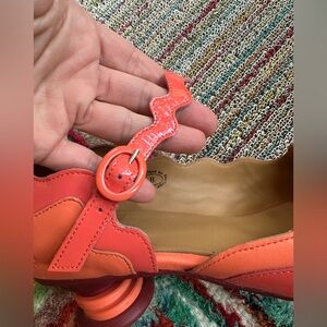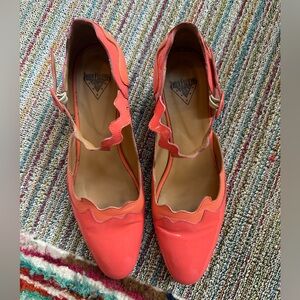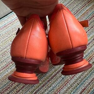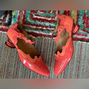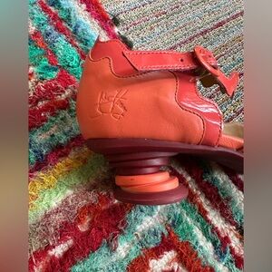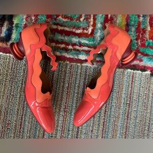 Excellent condition! A Mary Jane with a wavy twist -- the Trivialis is a delight, with coral pink patent leather and orange/pink smooth leather trim, a wavy patent strap and coral painted oval buckle, pointed toe, rubber soles, wavy edges with side cut-out, and the most fun asymmetrically stacked 1-in heel made of little pink/burgundy disks. In excellent condition - just some minor creasing across the toe. No other scuffs, marks, or flaws -- such a fun little shoe! They will fit true to length but are narrow for some. If you have a wider foot, think about going up a half size (can then work for a wider 7.5).