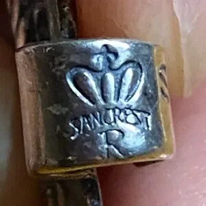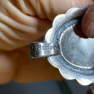 The belt is marked “Sancrest®” and “Sanford” (see photos). Metal is silver-tone and magnetic, indicating non-sterling base metal construction. This is a vintage fashion accessory, not Native American–made.