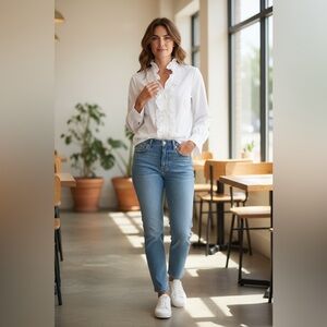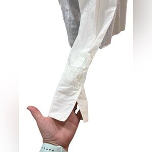 Crafted from a premium cotton blend with a hint of spandex, it offers a crisp look with comfortable stretch. The hidden side zipper ensures a sleek, tailored fit through the bodice, while the double-button cuffs add a sophisticated finishing touch. Whether paired with high-waisted trousers for the office or denim for a "jeans and a cute top" look, this blouse is a timeless staple.