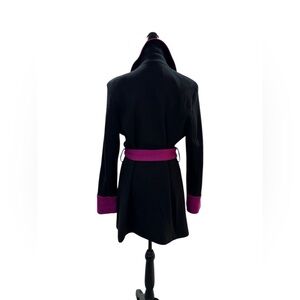 • Pop of Color: The fuchsia/magenta accents make this more than just a basic black coat—it’s a conversation starter.