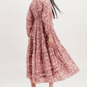 Fit: Billowy fit throughout with empire waistline Features: Cinch detail at the bust, front button-up closures, optional hook-and-eye closure above buttons, vintage-inspired floral print throughout, tiered seaming, cinched balloon sleeves