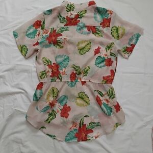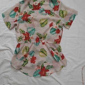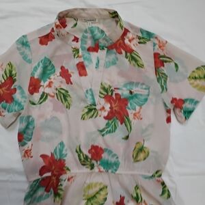 This chic blouse showcases a beautiful cream base adorned with vibrant red floral patterns and green foliage. The peplum design and mandarin collar add a touch of elegance, making it a versatile choice for various occasions. Crafted from lightweight fabric, it offers both comfort and style.