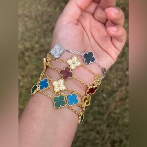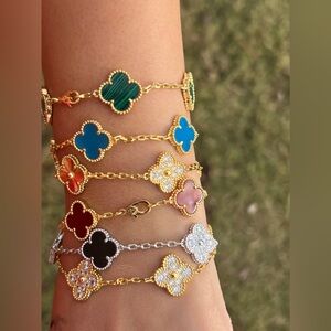 • Alternating clover charms with crystal accents and sleek black enamel for added dimension.