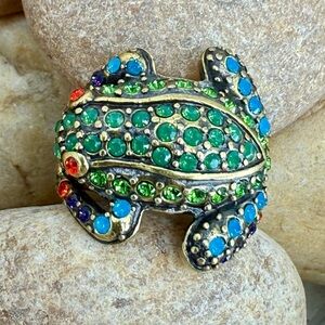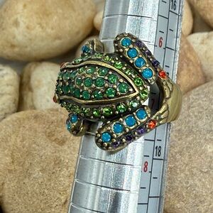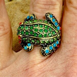Heidi Daus, frog ring, Swarovski crystal, green crystal ring, animal ring, novelty jewelry, statement ring, retired Heidi Daus, collectible jewelry, gold tone ring, couture costume jewelry, whimsical jewelry, frog jewelry, size 7 ring, multicolor crystal, designer ring