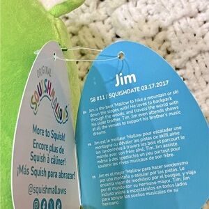 BIO: Pack a bag and get to know Jim! He is the best Squishmallow to hike a mountain with or ski down the slopes on a sunny, winter afternoon. Wouldn’t it be exciting to travel the world with your best friend? Jim gets to do just that with his older brother, Tim. Jim even attends shows at all the venues to support his brother’s music dreams.