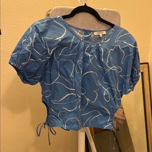 This Madewell blouse showcases a chic tie front and short puff sleeves, creating a playful and stylish silhouette. The blue and white color scheme, paired with an abstract floral design, adds a touch of artistic elegance. Ideal for casual occasions, this crop top is both versatile and fashionable.