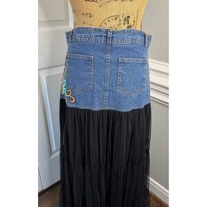 Elevate your style with this unique Vintage Collection denim jacket and skirt set, a captivating blend of classic denim and striking embroidered details. Vibrant floral embroidery bursts with color across the chest and pockets, accented by sparkling rhinestones that catch the light with every movement. The contrast of the traditional blue denim with sleek black sleeves and a flattering cut creates a modern yet timeless silhouette. This jacket is perfect for adding a touch of personality to your everyday outfits or for making a statement at a casual outing or a country music concert.