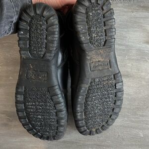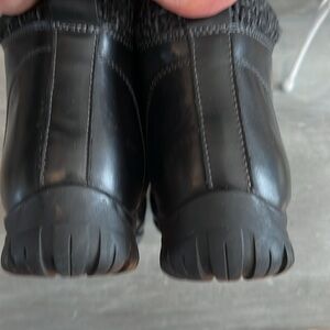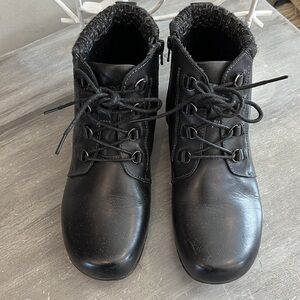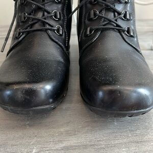 Super comfortable, black leather ankle boot. Side zippers so you don’t have to unlace, but you can tighten the laces if you choose to.