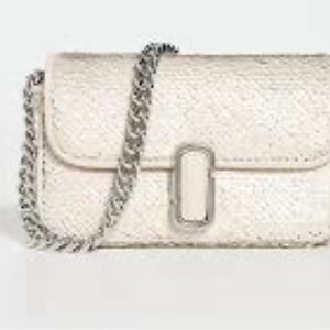 The handbag in the image is the Marc Jacobs The Sequin J Marc Shoulder Bag, typically in a cream or light taupe color with silver-tone hardware. The bag is covered in shimmering sequin embellishments and features the brand's signature "J Marc" logo emblem on the front flap.