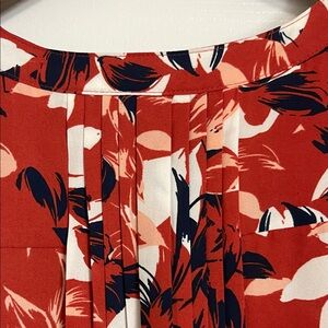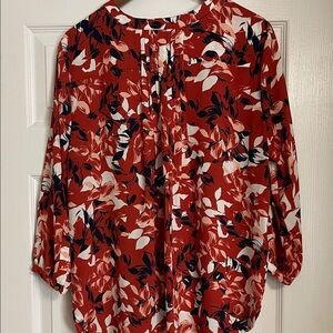 Chic red blouse with floral with navy and white floral design. Features a comfortable fit. Ideal for casual outings.