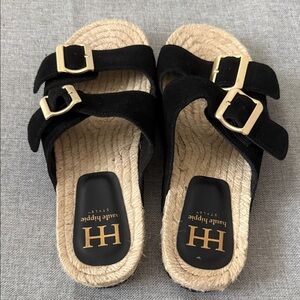 Elegant black sandals with striking gold buckles. Perfect for casual outings.
