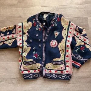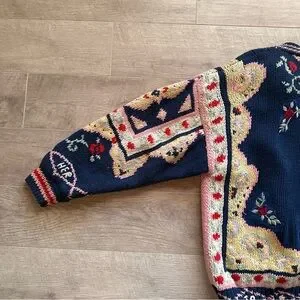 90s Together! Sweater Blue Yellow Knit Embroidered Button Up Cardigan